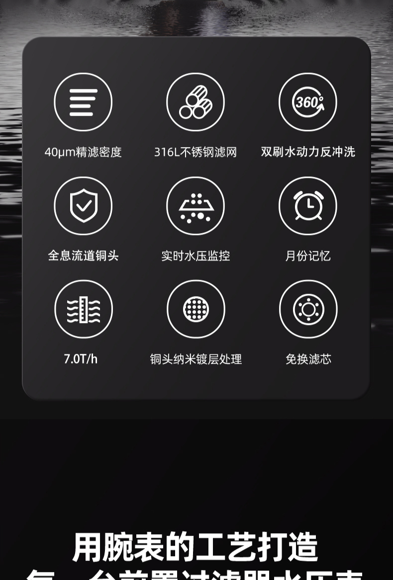 40μm精濾密度,316L不銹鋼濾網,雙刷水動力反沖洗,全息流道銅頭,免換濾芯